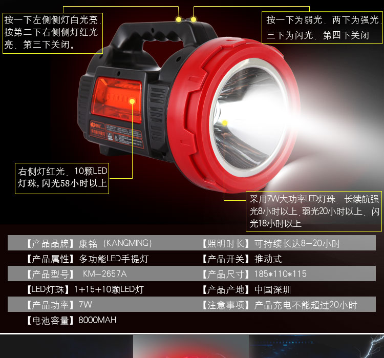 当前位置:首页 > 建筑建材-五金工具 > 康铭(KANGMING)LED手提灯充电强光探照灯户外露营手电筒 KM-2657A