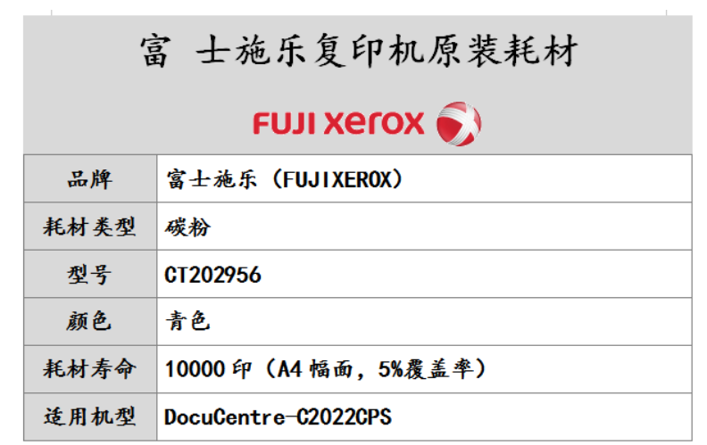 当前位置:首页 > 办公用品-硒鼓、粉盒-墨粉盒 > 富士施乐(FUJI XEROX) 复印机高容量碳粉 CT202956 (蓝色) 适用于SC2022