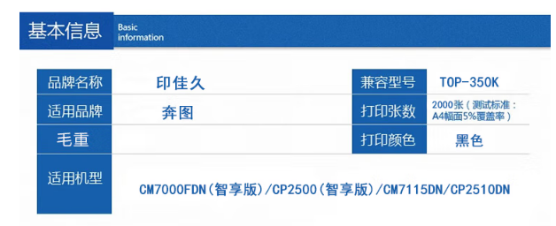 印佳久TOP-350BK黑色粉盒 (适用于奔图CM7000FDN(智享版)/CP2500(智享版)/CM7115DN/CP2510DN)